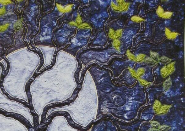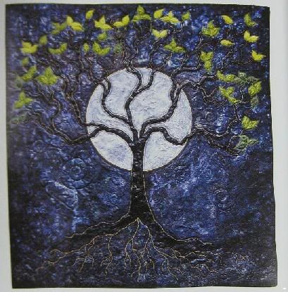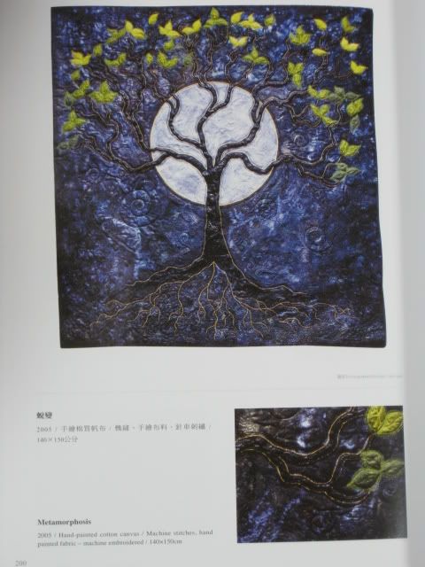 作者在棉質帆布上以手繪圖畫.再以針車刺繡押縫等技法.活化了這顆星空下的大樹